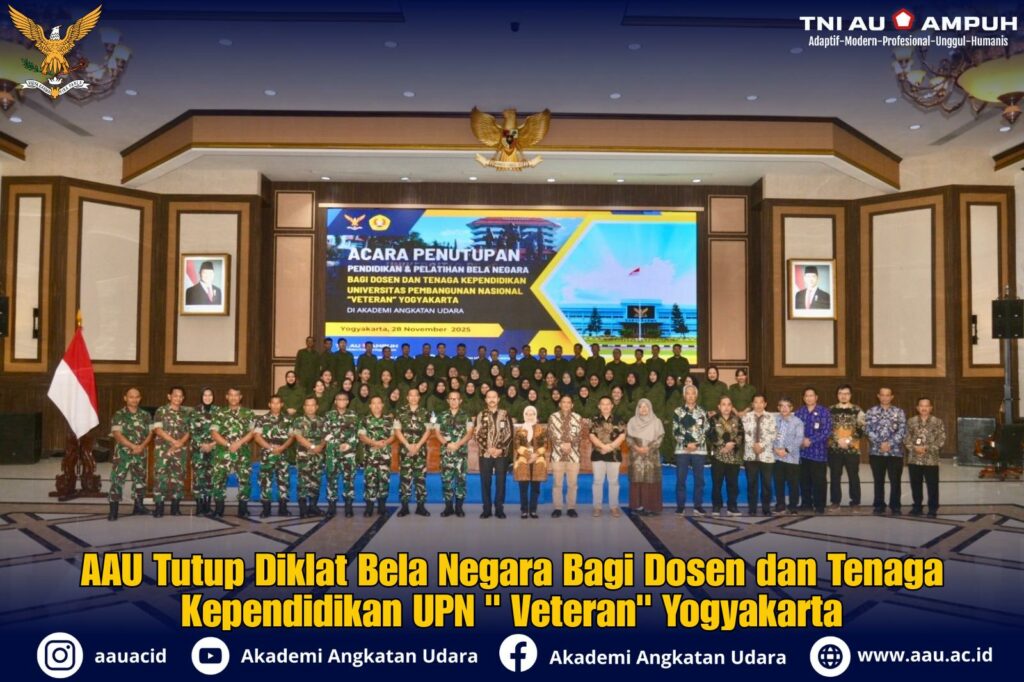 Yogyakarta (Pen-AAU). Akademi Angkatan Udara (AAU) menyelenggararakan Upacara Penutupan Pendidikan dan Latihan Bela Negara bagi Dosen dan Tenaga Kependidikan UPN “Veteran” Yogyakarta di Gedung Sabang Merauke, Jumat (28/11/2025).