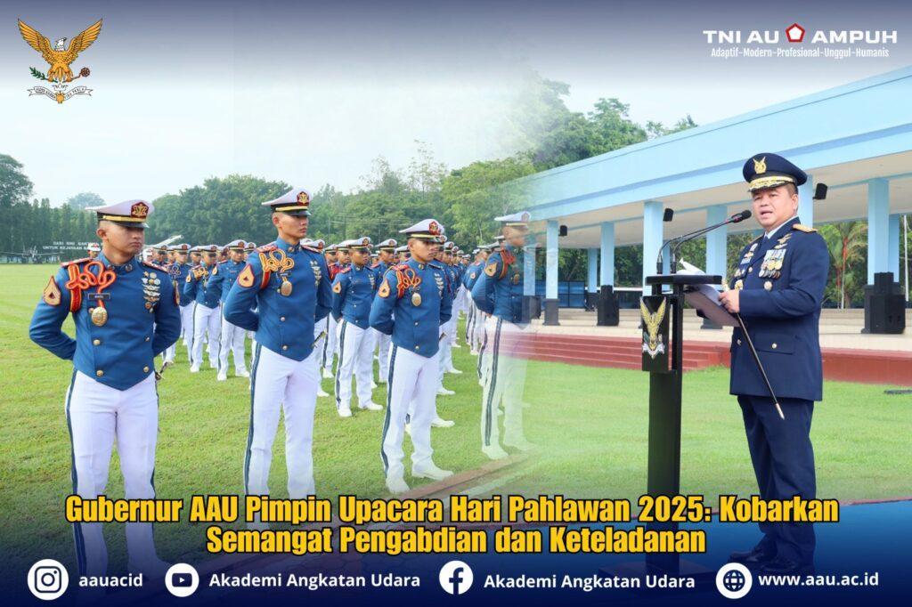 Hadir pada Upacara hari Pahlawan Wakil Gubernur AAU Marsma TNI Bonang Bayuaji Gautama, S.E., M.M., CHRMP., Sekretaris Lembaga AAU Marsekal Pertama TNI Harry Sofian, S.I.P., M.H., seluruh pejabat, dosen, instruktur, serta para Taruna AAU. Peringatan ini menjadi momentum bagi keluarga besar AAU untuk memperkuat komitmen dalam menjaga semangat patriotisme dan pengabdian tanpa pamrih bagi Indonesia. (penaau-2025).