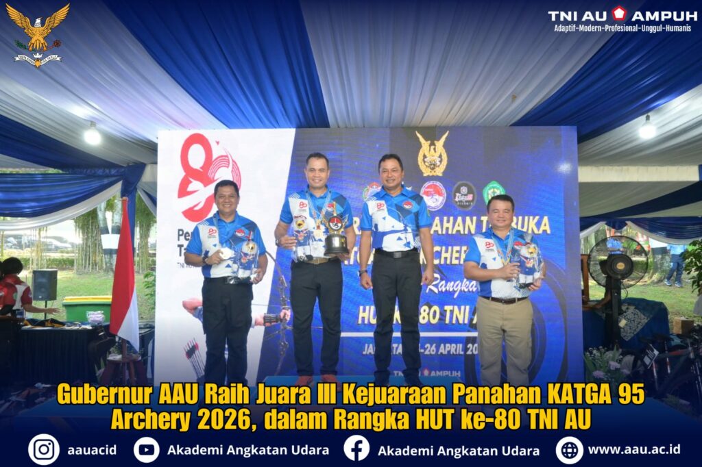 Jakarta (Pen-AAU). Gubernur Akademi Angkatan Udara (AAU), Marsekal Muda TNI Donald Kasenda, S.T., S.I.P., M.M., berhasil meraih Juara III pada kategori Barebow Eksekutif jarak 15 meter dalam Kejuaraan Panahan Terbuka KATGA 95 Archery 2026.