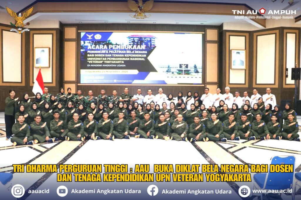 Yogyakarta. (Pen-AAU). Sebagai bentuk Tri Dharma Perguruan Tinggi, Akademi Angkatan Udara (AAU) membuka Pendidikan dan Pelatihan (Diklat) Bela Negara bagi Dosen dan tenaga kependidikan Universitas Pembangunan Nasional (UPN) “Veteran” Yogyakarta, bertempat di Gedung Sabang Merauke, Ksatrian Akademi Angkatan Udara (AAU) Yogyakarta, Senin (24/11/2025).